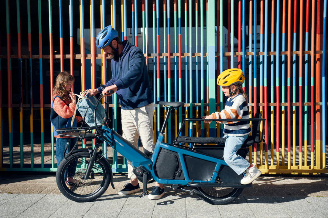 En la parte trasera de la Multitinker se pueden llevar de forma segura hasta dos niños o un pasajero mayor (hasta 70 kg). Gracias al cargador lateral de serie los acompañantes pueden apoyar los pies en todo momento. El protector de radios impide el contacto involuntario con los radios. El centro de gravedad bajo garantiza una conducción agradable para pequeños y mayores, y el caballete doble de serie permite subir y bajar de la bicicleta muy fácilmente.