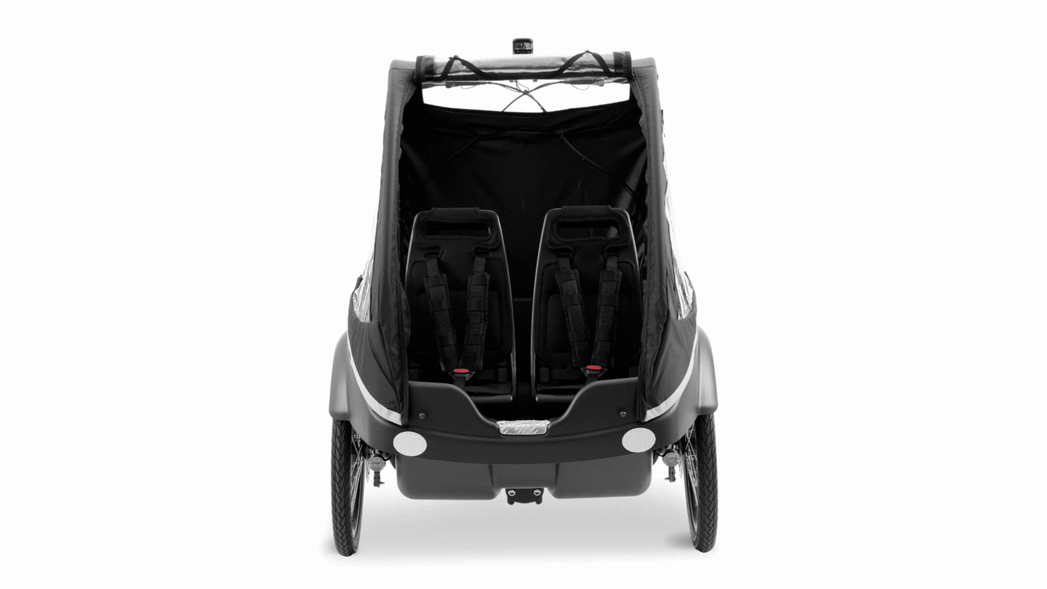 The cabin has a low entry, making it easy for children to get in and out of the cabin on their own. This prevents adults from having to do a lot of lifting. Plus, it's a great way to encourage kids to explore and be independent. The Cabin Hood has four windows and an opening rear panel. Plus, it has a sliding roof on top to easily keep an eye on the kids while they ride their bikes. When the windows are open, fresh air can easily circulate inside the cabin of the cargo bike, making it cool and comfortable on hot days. These openings are designed for external access to avoid the risk of children's hands sticking out of traffic. The canopy is made of water-repellent fabric and durable YKK zippers make it easy to open and close the front and windows.