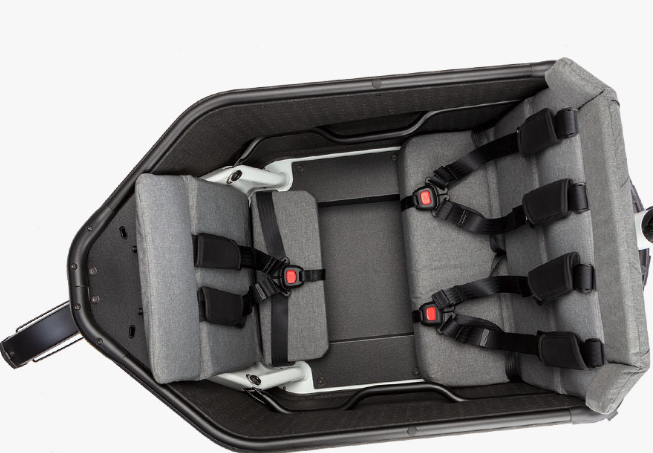 Accesorios Plataforma de Carga: Tres sillas infantiles. La silla infantil doble, con una posición sentada y otra tumbada, junto con una silla individual mirando hacia atrás, permite llevar hasta tres niños de hasta 7 años de edad. La seguridad queda garantizada con los cinturones de 5 puntos. Las sillas infantiles con los lados inclinados están fabricadas con material reciclado al 100 %. El asiento de la tercera silla infantil puede plegarse hacia atrás, de modo que se crea una especie de maletero separado. En caso de necesitar más espacio de carga es posible plegar hacia atrás los asientos de la silla infantil doble y hacia delante el de la tercera silla infantil.