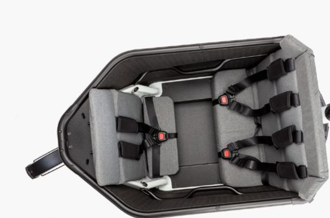 La silla infantil doble, con una posición sentada y otra tumbada, junto con una silla individual mirando hacia atrás, permite llevar hasta tres niños de hasta 7 años de edad. La seguridad queda garantizada con los cinturones de 5 puntos. Las sillas infantiles con los lados inclinados están fabricadas con material reciclado al 100 %. El asiento de la tercera silla infantil puede plegarse hacia atrás, de modo que se crea una especie de maletero separado. En caso de necesitar más espacio de carga es posible plegar hacia atrás los asientos de la silla infantil doble y hacia delante el de la tercera silla infantil. Antes de utilizarlas, consulte además la normativa de su país sobre el transporte de niños y respétela.